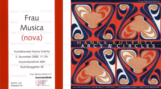 Hanna Kulenty's chamber and solo compositions based on the themes of “arches and circles” may be found on a new CD issued in Cologne, Germany by the Frau Musica Nova Foundation (Frau Musica 003).