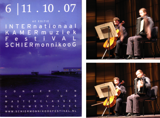 The WORLD PREMIÈRE of Preludium, Postludium and Psalm had been performed by the same Eneasz Kubit (accordeon) and Jan Skopowski (cello) on 9 October 2007 at the International Chamber Music Festival Schiermonnikoog 2007.